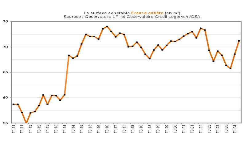 La surface achetable s’élève donc rapidement : + 2.8 m² entre le T2-2023 et le T2-2024. Mais + 5.5 m² depuis le point bas du T4-2023 !